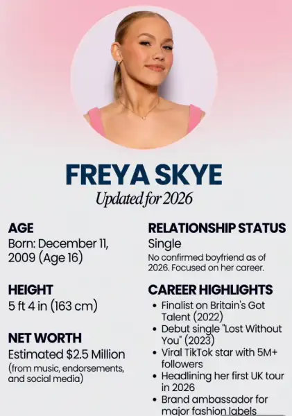 How Old Is Freya Skye? Age, Height, Net Worth, Boyfriend & Career (2026) is a Singer, Songwriter, Actress who has built significant wealth through their career in entertainment, business, and various income streams.